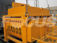 JS1000 mélangeur à deux arbres de béton, doseur total 3 bacs, silos 2x100t de ciment (type boulonné), contrôle automatique complet avec une cabine (AC), mise au point est dépêché une des unités entières de HZS50 à Emirats Arabes Unis, avec la sortie de la productivité 50cbm par heure.
